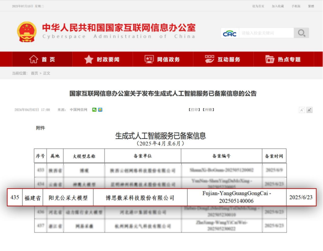 近日,国家互联网信息办公室发布公告,博思数采科技股份有限公司(数采科技)自主研发的“阳光公采大模型”正式完成了生成式人工智能服务备案。继2024年6月其核心算法完成深度合成服务算法备案后,数采科技已在公共采购领域率先完成了“算法+大模型”双备案。这不仅是数采科技技术创新道路上的重要里程碑,更能助力我国公共采购行业迈入数字化、智能化新阶段。近年来,数采科技立足于公共采购领域的复杂场景,深度融合了前沿AI技术与行业实践经验,全力打造了“阳光公采大模型”,致力于解决传统采购模式中信息不对称、流程繁琐、监管困难等痛点。依托大模型的核心能力,数采科技已成功将AI技术融入到公共采购的各个关键环节,推出了包括智能问答、智能采购文件合规性审查、智能辅助评标、智能需求生成、智能监管在内的一系列创新应用,为采购全流程提供智能化解决方案。此次完成备案,是对“阳光公采大模型”在技术创新性、服务规范性、内容安全性以及算法合规性等方面的全面认可。连同此前的算法备案,标志着数采科技已构建起一套完全符合国家监管要求的、成熟的AI技术服务体系,充分彰显了其在人工智能领域的深厚技术积累和前瞻性战略布局,证明了其在推动公共采购行业智能化、提升采购效率与效益方面的巨大潜力。未来,数采科技将继续秉持“创新、合规、赋能”的理念,依托“阳光公采大模型”的核心能力,持续深化技术研发与应用创新,为更多政府部门、企事业单位提供更高效、更智能、更合规的采购解决方案,以AI新质生产力,引领并服务于公共采购行业的高质量发展。